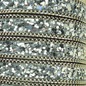 Flat Leather Cord with Silver Chain & Glitter Silver Color, 10×2.5mm