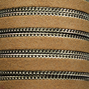 Fabulous flat suede cord with chain both borders. The back part of the cord is specially so chain will not rub on skin. It is also very supple and strong; perfect for making bracelets or necklaces. Easy to attach a clasp of to add bead sliders or charms.