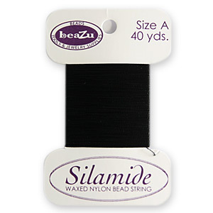 This Black Silamide is a 2 ply pre-waxed nylon thread made up of twisted filaments. The construction makes it exceptionally resilient, as well as colourfast. This Size A thread is very similar to Nymo Size D, or about 0.008in (0.20mm) in thickness. Silamide is remarkably versatile can be used for a number of projects, including: knotting, weaving, loom work, threading, pearl, crystal and gemstone stringing, braiding, and even on clothing!