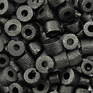 These short tube beads are hand carved from horn, dyed to a rich midnight black tone. They are the perfect ebony shade to be contrasted with our ivory or sepia toned bone beads. These tube beads are perfect for stringing in rows, and make intriguing spacers.