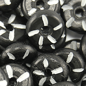 These disc shaped spacer beads add a touch of whimsy with a daisy like design. Dyed to a rich black tone, they are cut to reveal natural white bone in a striking pattern.