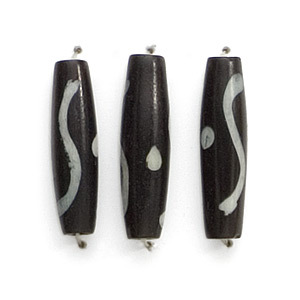 These 1 inch pipe beads are hand carved from horn, dyed to a rich midnight black tone, and then carefully bleached with a pattern of lines and dots in a crisp white. The smooth designs have a wild feel that will make you long for the savannah! Longer pipe beads are perfect for focal and dangle work, and make intriguing spacers.