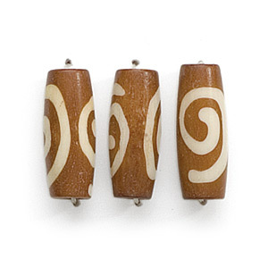 These 12mm x 8mm pipe beads are hand carved from horn, dyed a warm, rich caramel shade and then painstakingly bleached to create a crisp white pattern of spirals blossoming across the surface of the bead. The contrast of white on the brown, grained surface creates a beautiful, organic look.
