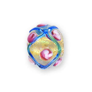These gold foil Venetian style beads are unique and handcrafted. Molten glass is applied to the foil to cover it, followed by more molten canes of colored glass are trailed over the bead giving it a unique finish. These beads are superior but due to being handmade they will vary slightly in size.