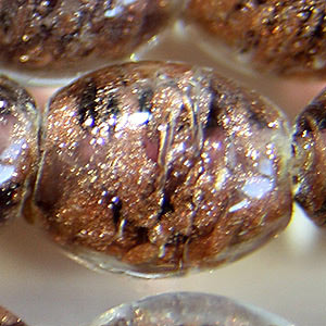 Oval glass beads with vividly colored centers, encased in clear glass and flecked with gold. The gold embellishments of these beads give them a rich, luxurious appearance that is emphasized beautifully when paired with gold or copper beads, findings and chain. Beads and their hole sizes may vary as they are handmade.