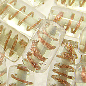 Transparent colorlined beads encased in clear glass with copper highlights. The glittering, metalic swirls of these beads make them perfect for pairing with metal beads or your favorite chain. Beads and their hole sizes may vary as they are handmade.