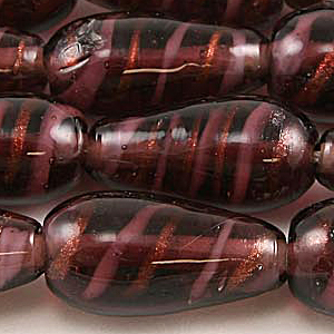 Handcrafted, transparent teardrop with colored center and copper foil swirl. These fantastic beads are a jewelry artist’s dream; sophisticated, stunning and affordable. Wirewrap these beads next to your favorite chain and pair them with crystal for a truly gorgeous result. Beads and their hole sizes may vary as they are handmade.