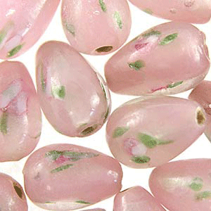 Handcrafted, pink opaque drop encased in a thin layer of clear glass with pink flower designs. These delicate beads look so lovely next to crystal beads or semi precious gemstones; perfect for a pair of earrings. Beads and their hole sizes may vary as they are handmade.