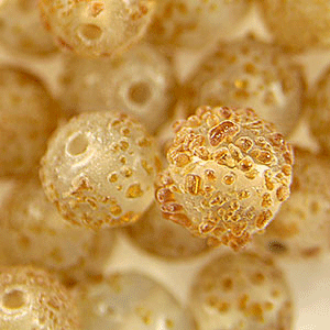 The attractive, transparent beads are dusted with a coating of fine glass, giving them a fantastic texture and a truly unique look. Beads and their hole sizes may vary as they are handmade.