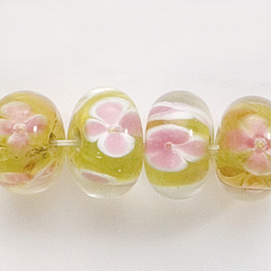 Bead, Lampwork Glass, 12x7mm Rondelle Crystal Glass lined in Chartreuse with White and Pink Flower (Hole Size 2.3mm)