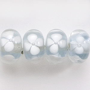 Bead, Lampwork Glass, 12x6mm Rondelle Crystal Glass lined in Light Sapphire with White Flower (Hole Size 2.3mm)