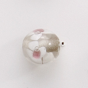 Bead, Lampwork Glass, 12mm Round shape with flower design – White / Rose / Crystal (Hole Size 2mm)