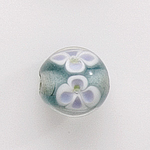 Bead, Lampwork Glass, 12mm Round shape with flower design – Pink / White / Aqua (Hole Size 2mm)