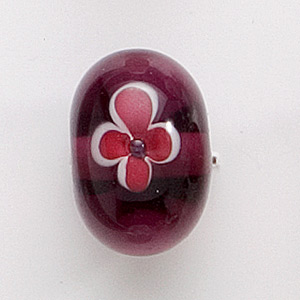 Bead, Lampwork Glass, 20x14mm Rondelle Shape with Red / White flower design on Amethyst color bead (Hole Size 2.75mm)