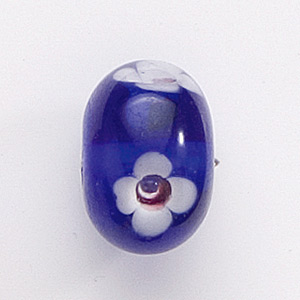 Bead, Lampwork Glass, 20x14mm Rondelle Shape with White / Rose flower design on Cobalt color bead (Hole Size 2.75mm)