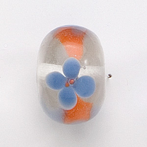 Bead, Lampwork Glass, 20x14mm Rondelle Shape with Blue / Orange flower design on Crystal Bead (Hole Size 2.75mm)