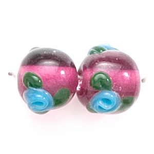 Bead, Lampwork Glass,10mm Round Transparent Glass with Rose Colourlined and raised Rose Flower design(Hole Size 2.5mm)