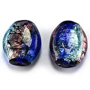 Bead, Lampwork Glass, 16x13x7mm Flat Oval with Silverfoil and multicolour – Amethyst/Blue/Cobalt (Hole Size 2.5mm)