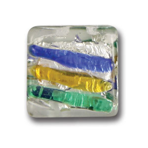 Bead, Japanese Sassoon Lampwork Glass, 24mm Flat Square bead with Silverfoil and Color Stripes – Green/Topaz/Blue (Hole Size 1.7mm)
