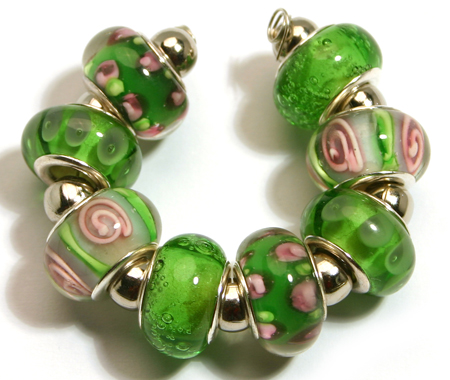 This gorgeous set contains all eight beads as shown; each bead measures approximately 9 x 15mm, but can vary slightly as they are handmade. These extremely popular and fashionable Chimera Beads are designer quality in a delightfully wide array of colors and designs at fantastic low prices. Because of the large hole (6mm) and plated metal core, you can use these beads with almost any stringing material you can imagine. They are also compatible with Pandora, Troll and other large hole glass beads. These beautiful sets come with a wonderful variety of beads for you to try- simply pair with our selection of pewter Chimera Beads and string on one of our ready-to-wear snakechains for exquisite pieces of jewelry that you will love to wear.
