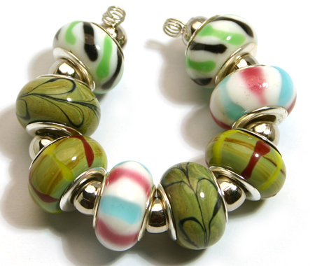 This gorgeous set contains all eight beads as shown; each bead measures approximately 9 x 15mm, but can vary slightly as they are handmade. These extremely popular and fashionable Chimera Beads are designer quality in a delightfully wide array of colors and designs at fantastic low prices. Because of the large hole (6mm) and plated metal core, you can use these beads with almost any stringing material you can imagine. They are also compatible with Pandora, Troll and other large hole glass beads. These beautiful sets come with a wonderful variety of beads for you to try- simply pair with our selection of pewter Chimera Beads and string on one of our ready-to-wear snakechains for exquisite pieces of jewelry that you will love to wear.