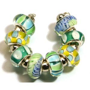 This gorgeous set contains all eight beads as shown; each bead measures approximately 9 x 13mm, but can vary slightly as they are handmade. These extremely popular and fashionable beads are designer quality in a delightfully wide array of colors and designs at fantastic low prices. Because of the large hole (6mm) and plated metal core, you can use these beads with almost any stringing material you can imagine. They are also compatible with Pandora, Troll and other large-hole glass beads. These beautiful sets come with a wonderful variety of beads for you to try- simply pair with our selection of large hole beads string on one of our ready-to-wear snake chains for exquisite pieces of jewelry that you will love to wear.