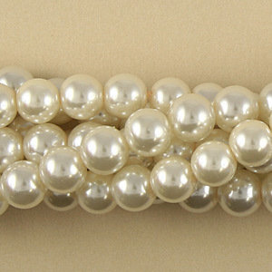 Superb quality glass pearls at a super low price. Pearlized coating is luxurious and durable all the way to the hole. Weight of glass feels like real pearls. Temporarily strung on 16-in of soft woven polyester cord. Sold per 10 strands of 16-in per strand.