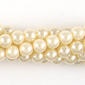 Superb quality glass pearls at a super low price. Pearlized coating is luxurious and durable all the way to the hole. Weight of glass feels like real pearls. Temporarily strung on 16-in of soft woven polyester cord. Sold per 10 strands of 16-in per strand.