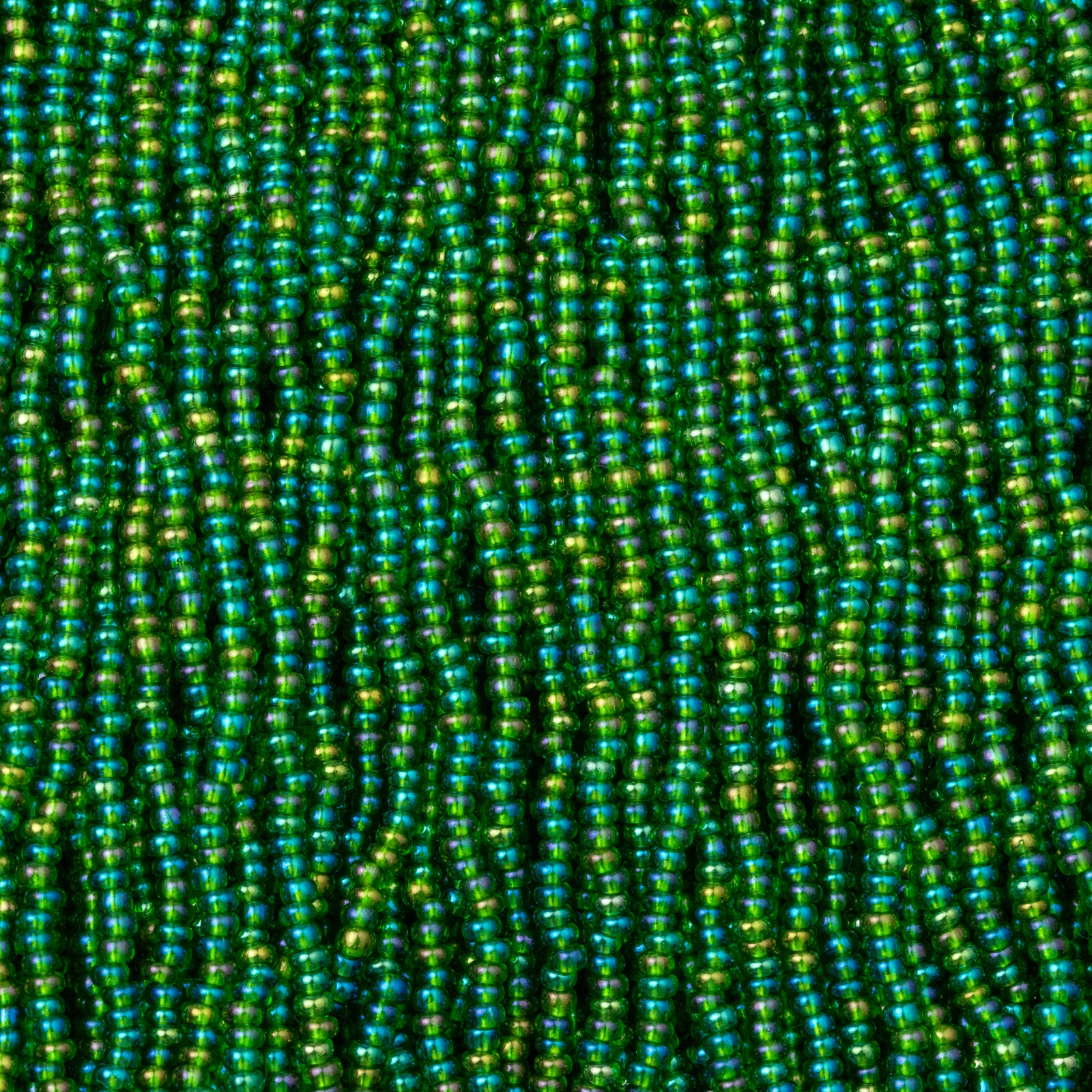 Czech Seed Beads, 11/0 – Transparent Rainbow Light Emerald (strung)