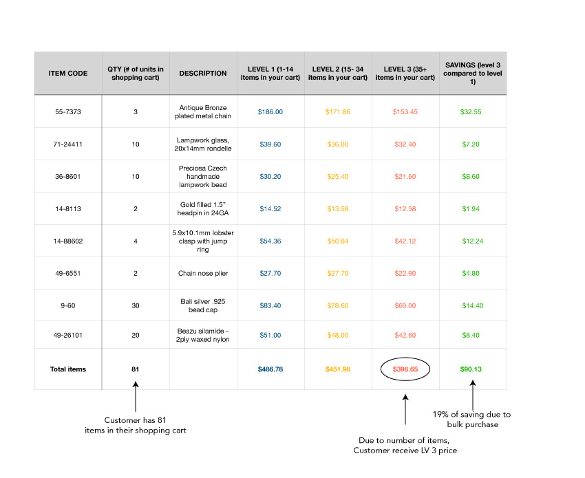 Because the total of items in the customer’s shopping cart is more than 35, the customer pays the Level 3 price and save $90.13.