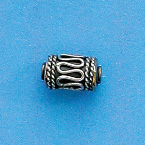 Handcrafted .925 Bali silver tube bead with double rows of braided texture at each end and snaking loop design around body of bead. Oxidized background and bright silver detailing give this bead wonderful contrast. Add real artistry to your creations with this intricate Bali bead. Beads and their hole sizes may vary as they are handmade.