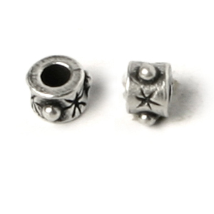 Bead, Pewter 5x3mm Tube shape with star and dot design. Hole size is ideal for all leather and waxed Cotton Cord or just use a spacer bead. All beads are Lead Free.