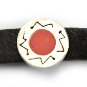 Outstanding slider bead with red enamel center and cool design around the edge of slisder bead This make you jewelry a timeless piece. Use one strip of 10mm flat leather or two strips of 5mm flat leather with it.