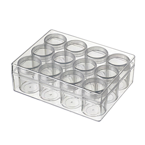 This Clear Acrylic Organizer Box contains twelve Storage Jars in a convenient, thin package that can be easily stored, carried, stacked or shelved as easily as a book! The 16cm x 12 cm x 5.5 cm box holds the twelve 38mm x 50mm jars perfectly, each with a screw top lid for extra security. The clear plastic makes it easy to keep findings, seedbeads, focals, gemstones and more easily organized and available at a quick glance. A must have for anyone who wants to get organized, or for keeping tiny components under control!