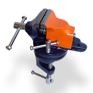 This mini bench vice has smooth jaws and is designed for work on soft metals. It is adjustable at three points for mounting, rotation, and pressure. You can choose to have the vice rotate freely, or fix it at a particular angle.