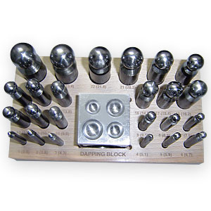 This full 25 piece dapping set has 24 steel punches, and 1 solid steel block. The block has 18 half sphere depressions with sizes ranging from from 3mm to 35mm. The doming punches have full spheres made of hardened steel and range in size from 2.3mm to 25mm. Everything comes with a wooden stand, which keeps your set organized and tidy with well marked sizes.