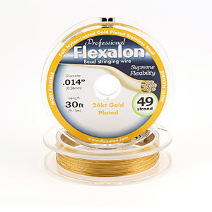 Flexalon is a nylon coated, flexible, stainless steel, bead stringing material. This clear coated 49 strand wire is plated with 24k gold, offers the highest quality and is the professionals choice. The superior drape and flexibility of 49 strand wire virtually eliminates coiling or kinking.